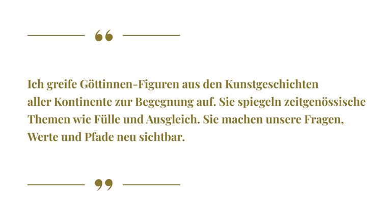 Meine hängbaren Goldfresken, inspiriert von den Göttinnenfiguren verschiedenster Kulturen, erzählen von Fülle, Balance und innerer Stärke. Sie entstehen in aufwendigen Schichten und Sedimentation aus Pigment, Acryl und 24-karätigem Gold—als leuchtende Symbole für Wandel und Verbundenheit.
